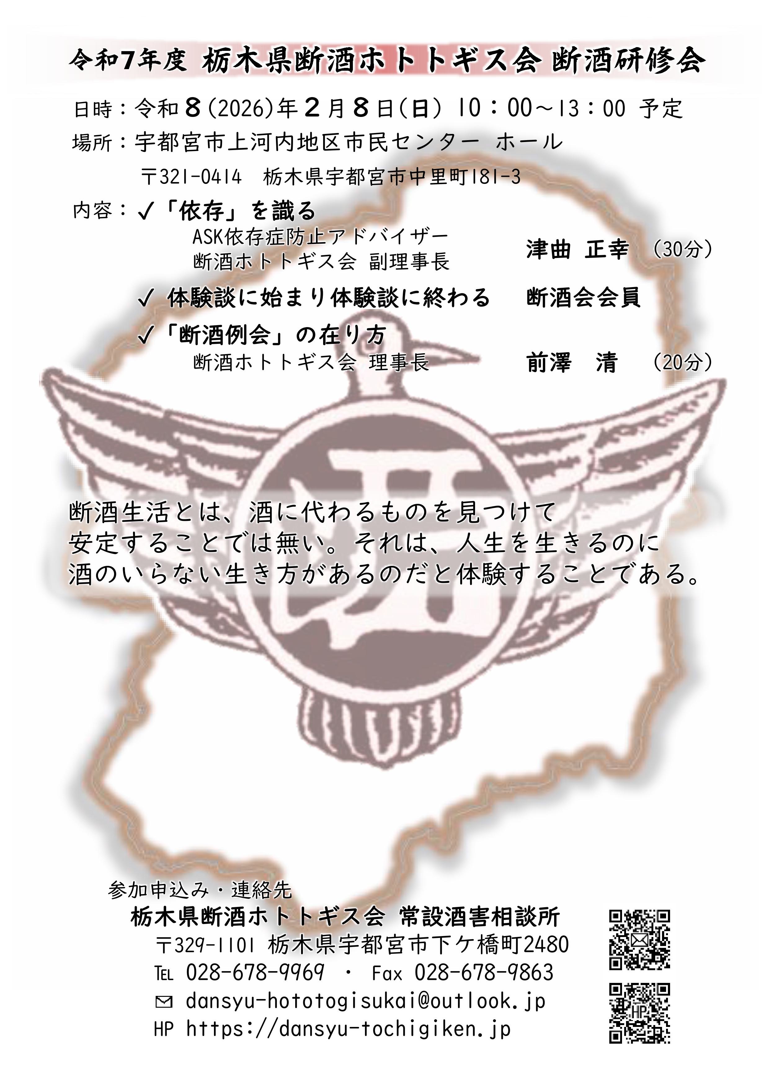 令和8年2月8日(日) 断酒研修会 実施します。 →